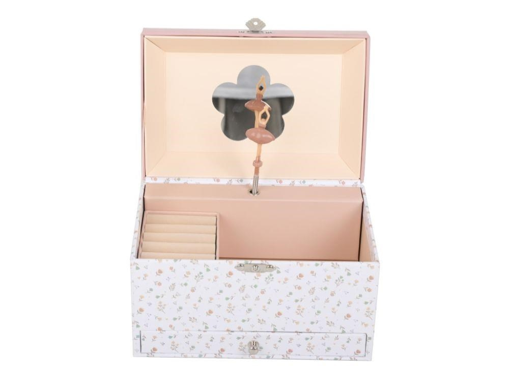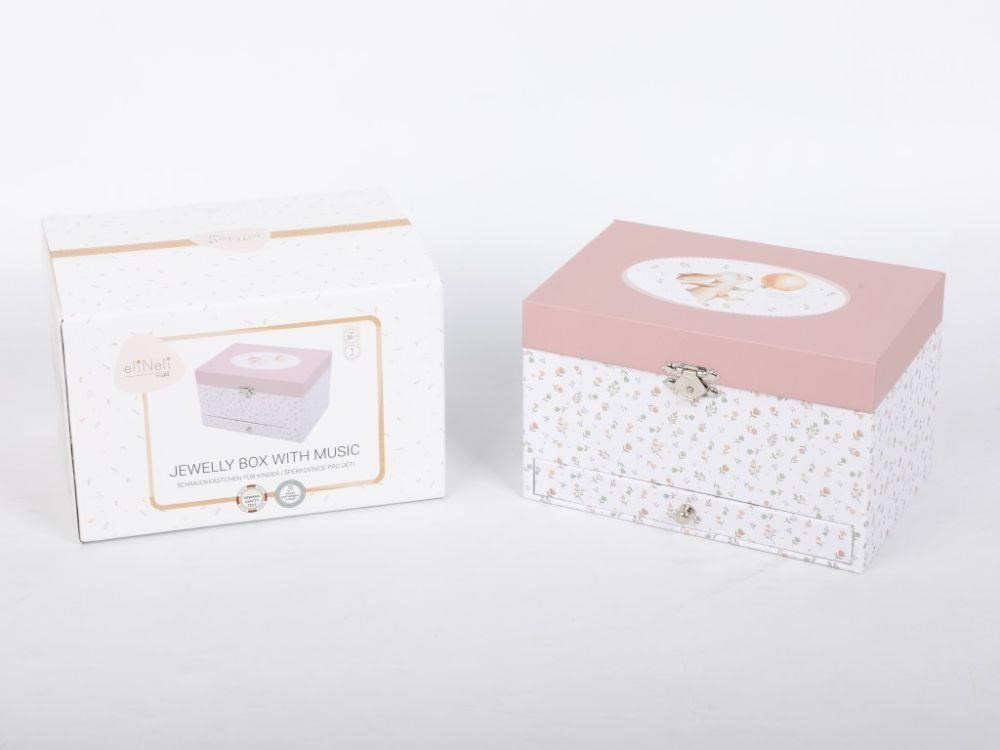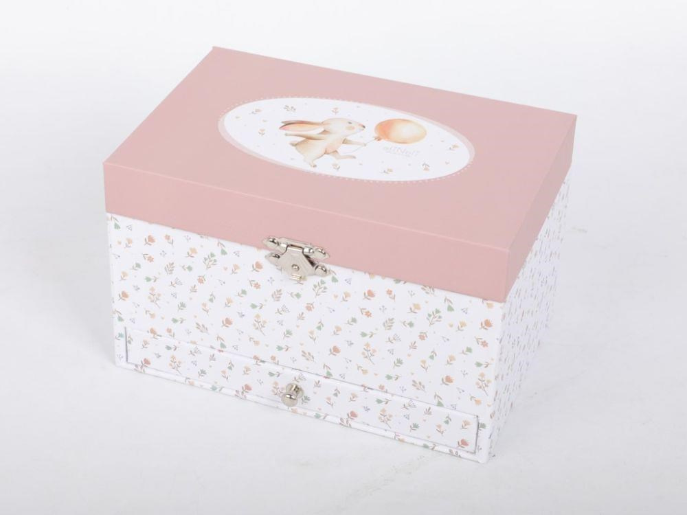 Dětská šperkovnice zdobená drobnými květy, s roztomilým zajíčkem na víku, okouzlí každou malou parádnici. Šperkovnice pro děti, s členěným vnitřním prostorem a praktickou zásuvkou ve spodní části nabízí dostatek místa pro uložení prstýnků, dívčích šperků, drobných pokladů. Uvnitř šperkovnice se ukrývá nejen zrcátko, ale i něžná baletka, která vaší holčičce ráda zatančí..