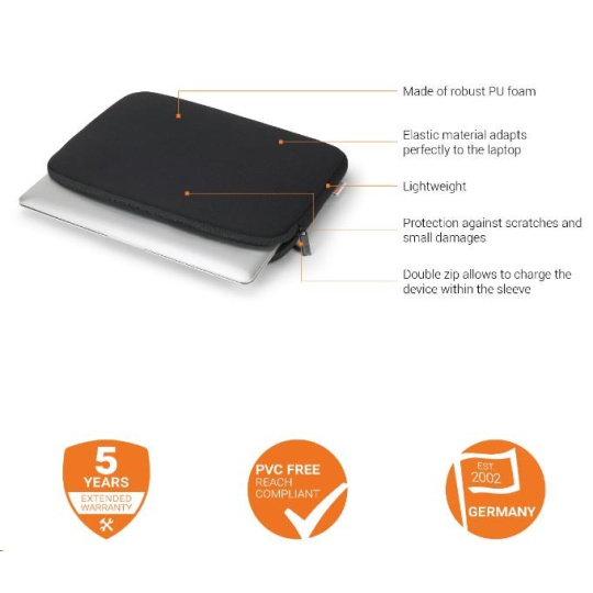 Product Description The Sleeve is made of robust PU foam which perfectly adapts to the form of your notebook like a second skin. The best guaranty against surface scratches and other dents and damages. The design is not only robust, but also extremely light. Your notebook can thus be transported flexibly without taking up a lot of space in your bag. The Sleeve is equipped with two zippers. This allows you to charge your notebook or Ultrabook conveniently, without taking it out of the Sleeve. Another advantage: The zipper is fitted with an extra surface on the inside in order to avoid scratches on the notebook. Made of robust PU foam The elastic material adapts perfectly to the laptop Offers reliable protection against scratches and small damages Double zip allows to charge the device within the sleeve Picture may differ slightly from the original Additional Information Product Dimensions 370 x 260 x 25 mm EAN 7640186417372 Material Jersey fabric with PU foam Colour camel brown Protects your notebook perfectly from scratches and small damages. Art. No. D31972 Weight 0.1 kg Screen size 14 – 14.1” Notebook size ? 350 x 245 x 30 mm; ? 13.78 x 9.65 x 1.18 inches Warranty 5 years extended warranty.