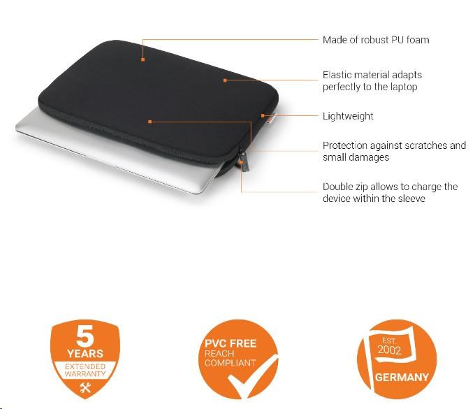 Product Description The Sleeve is made of robust PU foam which perfectly adapts to the form of your notebook like a second skin. The best guaranty against surface scratches and other dents and damages. The design is not only robust, but also extremely light. Your notebook can thus be transported flexibly without taking up a lot of space in your bag. The Sleeve is equipped with two zippers. This allows you to charge your notebook or Ultrabook conveniently, without taking it out of the Sleeve. Another advantage: The zipper is fitted with an extra surface on the inside in order to avoid scratches on the notebook. Made of robust PU foam The elastic material adapts perfectly to the laptop Offers reliable protection against scratches and small damages Double zip allows to charge the device within the sleeve Picture may differ slightly from the original Additional Information Product Dimensions 370 x 260 x 25 mm EAN 7640186417372 Material Jersey fabric with PU foam Colour camel brown Protects your notebook perfectly from scratches and small damages. Art. No. D31972 Weight 0.1 kg Screen size 14 – 14.1” Notebook size ? 350 x 245 x 30 mm; ? 13.78 x 9.65 x 1.18 inches Warranty 5 years extended warranty.