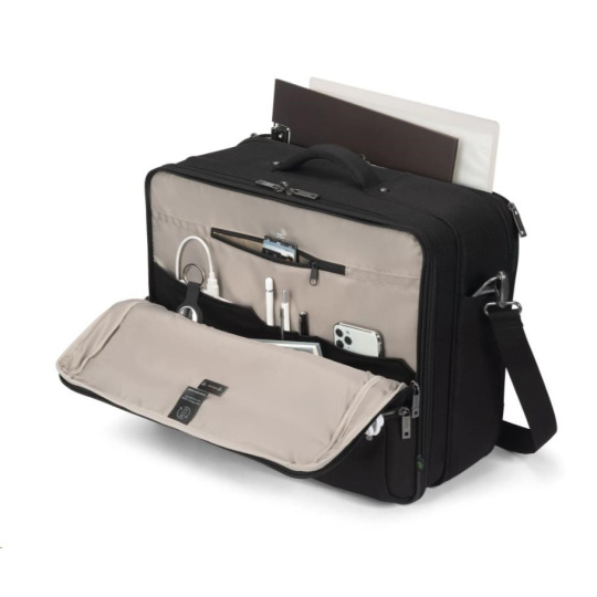 MULTI TWIN FIVE je bezpečný, funkční a ekologický společník pro každodenní pracovní potřeby. Uzamykatelná přihrádka na notebook s pěnou HDF poskytuje robustní ochranu, zatímco vnitřní přihrádka na tablet zajišťuje, že menší zařízení jsou stejně bezpečná. Ve vyhrazené zadní přihrádce jsou uspořádány dokumenty, zatímco přední část nabízí strukturované kapsy na příslušenství. Tato brašna, promyšleně navržená pro pohodlí, je navíc vyrobena ze 41 recyklovaných PET lahví, což spojuje udržitelnost s každodenní praktičností.