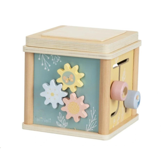 Dřevěná activity cube (kostka) se zvířátky si pro děti připravila spoustu aktivit, které potrénují a zdokonalí dětské dovednosti. Aktivity kostka vyrobená z masivního dřeva, překližky a MDF nabízí spoustu možností ke hře. Samotné víko (vrchní stranu) dřevěné kostky představuje zábavné bludiště v pastelových barvách, které dětem se svými zakroucenými drátky a dřevěnými korálky trochu zamotá hlavu. Jedna ze stran je vkládačkou, druhá bludištěm, třetí rozkvetlou loukou s květinami v podobě ozubených koleček a čtvrtá zábavnou hrou s otočnými destičkami.