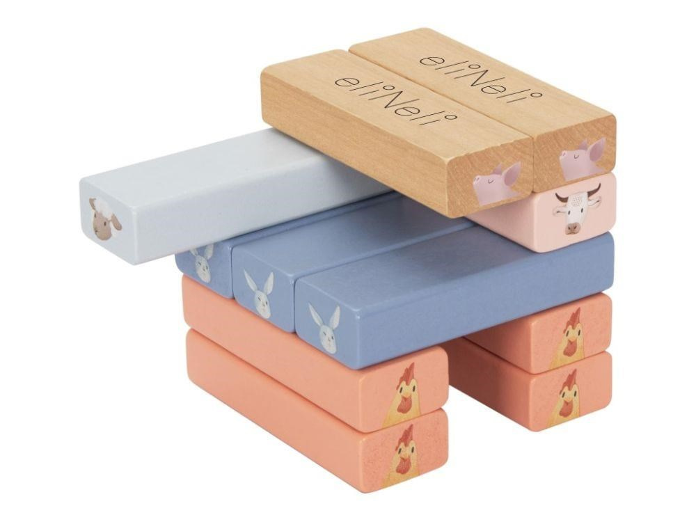 Dřevná skládací věž Jenga v příjemných pastelových barvách, s motivem zvířátek z farmy, s bohatým příslušenstvím, je zábavnou hrou pro děti i celou rodinu. Skládací věž nabízí spoustu možností ke hře s různou mírou obtížnosti. Ty nejmenší děti si pohrají s dřevěnými kostkami, větší děti postaví věž a pokusí se vytahovat kostky s motivem zvířátka, které padlo na kostce nebo si vylosovaly z kartiček a ti největší šikulové mohou kostky z věže vytloukat kladívkem..