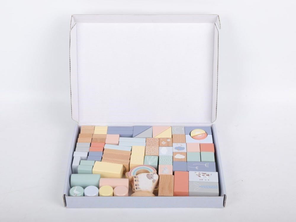 Sada dřevěných kostek s motivem Farma nabízí spoustu možností ke hře. Využití stavebních kostek je široké, přináší spoustu zábavy a zdokonalují dětské dovednosti. Z kostek děti hravě postaví farmu s oblíbenými hospodářskými zvířátky, ovečkou a nafrněným prasátkem, využijí je při hře s autíčky a hracími koberci. Sada 70 kostek je montessori hračkou se zvířátky v realistickém provedení..