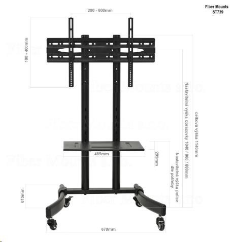 Technické údaje: maximální zatížení vozíku 40kg maximální zatížení police 5kg podpora VESA standardu 200x100 až 600x400 doporučená úhlopříčka televizoru 32" až 65" celková výška stojanu 1140mm stavitelná výška obrazovky ve 3 pozicích 104 / 96 / 88cm (výška po střed televizoru) police na příslušenství o rozměrech 485x295mm stavitelná výška police - možnost demontáže pevný, stabilní podstavec o rozměrech 670x615mm barevné provedení černé ekonomické balení o rozměrech 1060x350x120mm a hmotnosti 15kg záruka 2 roky Vozík na televizi Fiber Mounts ST739 podporuje VESA standardy: VESA 200x100 VESA 200x200 VESA 300x200 VESA 300x300 VESA 400x200 VESA 400x300 VESA 400x400 VESA 600x400.