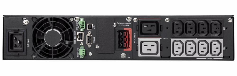 | Komunikace | USB port (kompatibilní s HID) Sériový port (RS232) Mini svorkovnice pro dálkové zapnutí / vypnutí (ROO) a vzdálené vypnutí (RPO) Mini svorkovnice pro výstupní relé Bezpotenciálové kontakty (3 výstupy, 1 vstup, optočlen, DB9) |