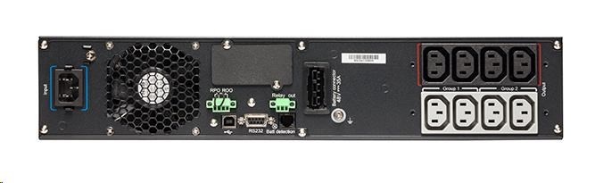 | Komunikace | USB port (kompatibilní s HID) Sériový port (RS232) Mini svorkovnice pro dálkové zapnutí / vypnutí (ROO) Mini-svorkovnice pro vzdálené vypnutí napájení (RPO) Mini svorkovnice pro výstupní relé Bezpotenciálové kontakty (3 výstupy, 1 vstup, optočlen, DB9) Komunikační karta |