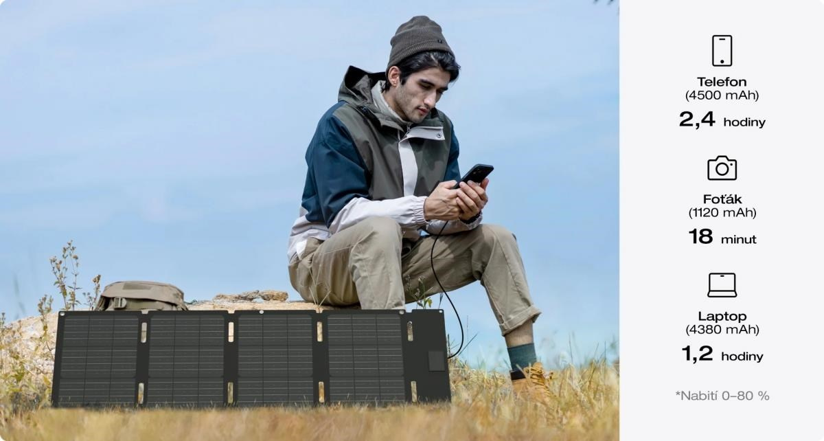 Skládací solární panel EcoFlow 45 Wp je ideálním panelem na cesty. Může dobíjet veškerá USB-C mobilní zařízení, například mobily, laptopy, čelovky apod. Díky druhému výstupu DC5521 jej můžete připojit i k solárním regulátorům bateriových stanic EcoFlow řady RIVER a DELTA.