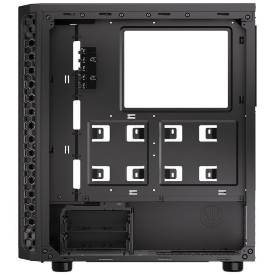 Skříň formátu Middle Tower s průhlednou bočnicí z tvrzeného skla nabízí dvě 2,5" pozice pro SSD disky a dvě 3,5" pozice pro pevné disky. Na horní části se nachází dva USB 3.0 porty, sluchátkový výstup a audio vstup pro mikrofon. Vybavena je dvěma 120 mm ventilátory, které spolu s perforovaným čelním panelem zajišťují dostatečné proudění vzduchu. Důmyslné řešení umožňuje pohodlné umístění až 360 mm dlouhého výměníku vodního chlazení na přední straně. Ve skříni je dostatek prostoru pro chladič CPU do výšky až 161 mm a grafickou kartu o délce až 350 mm. Dodávána je bez zdroje. Součástí je také sada prachových filtrů.