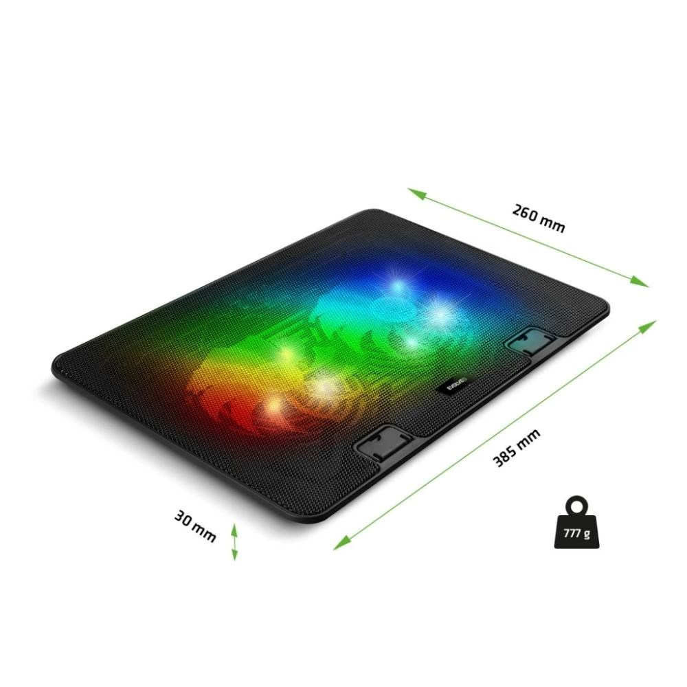 Podstavec je vybaven dvěma 125mm ventilátory, které zajišťují rovnoměrný odvod přebytečného tepla. Ať už se tak věnujete RPG hrám, FPS akcím, nebo online hraní, které dává vašemu počítači pěkně zabrat, nemusíte se obávat poklesu výkonu – podložka udrží váš notebook chladný i při dlouhém herním maratonu. Ventilátory jsou také opatřeny 8000 ventilačními otvory o průměru 2 mm (pro optimální průtok vzduchu) a navrch doplněny působivým RGB osvětlením, které hraje všemi barvami a stylově dokresluje gamingovou atmosféru.
