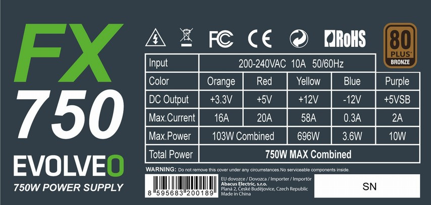 EVOLVEO FX 750 , zdroj 750W ATX, 14cm, tichý, 80+ bronze, bulk, záruka 3 roky