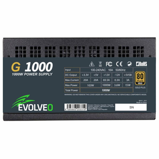 Zdroj EVOLVEO G1000 je ideální volba pro herní počítač, který má osazenou grafickou kartu s rozhraním PCIe 5.0. Vyjímá se především účinností s certifikací 80 PLUS GOLD zaručující účinnost až 90%. Zdroj je plně modulární, z toho důvodu je možné připojit jen nejnutnější kabely. Součástí je i tichý 140mm ventilátor. V kombinaci se semi-pasivním chlazení do 30% zatížení je zaručen tichý chod zdroje. Semipasivní chlazení, ventilátor zdroje je obvykle neaktivní a spustí se pouze při překročení 20% hranice výkonu zdroje. Nedílnou součástí jsou i ochrany proti poškození komponent v PC a i zdroje samotného.