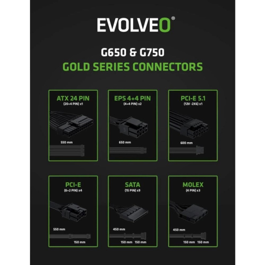Zapomeňte na zamotané kabely, které brání proudění vzduchu a ještě vaší počítačové skříni kazí styl. Zdroj EVOLVEO G750-WH je plně modulární, takže k němu připojíte jen ty kabely, které opravdu potřebujete. Součástí balení jsou všechny důležité šňůry – jeden kabel ATX 24 PIN, dva EPS 4+4 PIN, dva PCI-E 6+2 PIN, jeden PCI-E 5.1 12V-2×6, tři SATA a jeden MOLEX. Díky tomu máte místo na vše od CPU a GPU přes disky až po vymazlené LED pásky či jiné extra prvky.