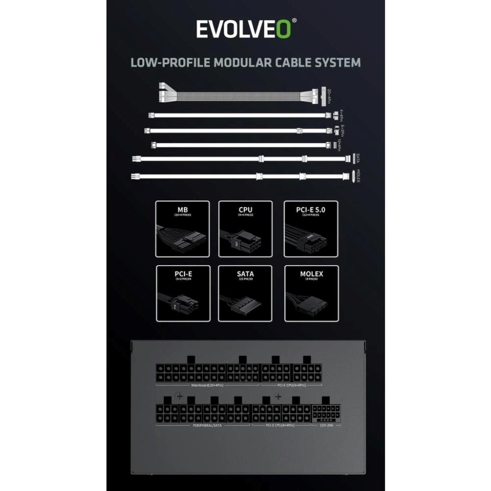 Zapomeňte na zamotané kabely, které brání proudění vzduchu a ještě vaší počítačové skříni kazí styl. Zdroj EVOLVEO G750-WH je plně modulární, takže k němu připojíte jen ty kabely, které opravdu potřebujete. Součástí balení jsou všechny důležité šňůry – jeden kabel ATX 24 PIN, dva EPS 4+4 PIN, dva PCI-E 6+2 PIN, jeden PCI-E 5.1 12V-2×6, tři SATA a jeden MOLEX. Díky tomu máte místo na vše od CPU a GPU přes disky až po vymazlené LED pásky či jiné extra prvky.