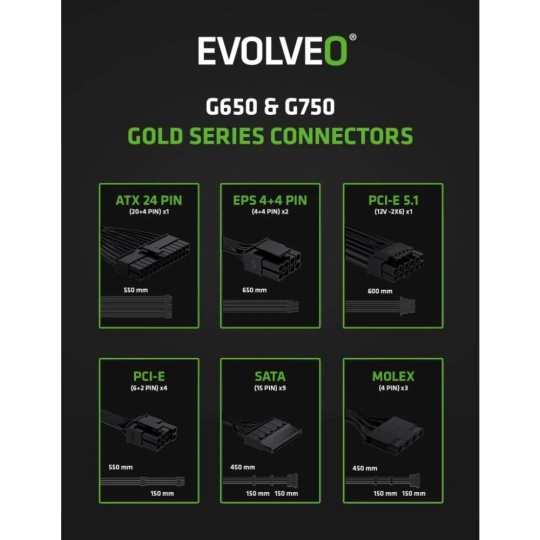 Zapomeňte na zamotané kabely, které brání proudění vzduchu a ještě vaší počítačové skříni kazí styl. Zdroj EVOLVEO G850-BK je plně modulární, takže k němu připojíte jen ty kabely, které opravdu potřebujete. Součástí balení jsou všechny důležité šňůry – jeden kabel ATX 24 PIN, dva EPS 4+4 PIN, dva PCI-E 6+2 PIN, jeden PCI-E 5.1 12V-2×6, tři SATA a jeden MOLEX. Díky tomu máte místo na vše od CPU a GPU přes disky až po vymazlené LED pásky či jiné extra prvky.