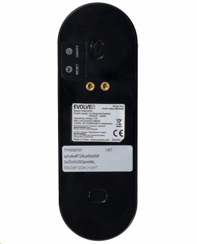 | Obsah balení | EVOLVEO Ringo DB2, chytrý videozvonek Zvonek do zásuvky Uživatelský manuál Plochá montážní konzole Úhlová montážní konzole 3M samolepící montážní nálepka Nabíjecí kabel USB Malý inbusový klíč Bezpečnostní šroub 2x montážní šroub + hmoždinky 2x montážní šrouby pro úhlovou konzoli 2x připojovací vodiče pro pevnou kabeláž 2x šrouby pro připojení vodičů |