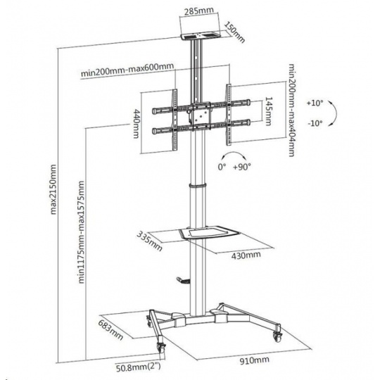 Exkluzivní mobilní stojan na televize Fiber Novelty FN5000 Televizní stojan výborné kvality a unikátní konstrukce, která umožňuje plnou nastavitelnost pozice Tv Velmi pěkný televizní stojan s unikátní konstrukcí, díky které velmi snadno nastavíte výšku televizoru i náklon, držák má funkci pivot díky kterému můžete dát obrazovku klasicky na šířku (horizontálně) nebo i na výšku (vertikálně). Podstava stojanu je osazena 4 kvalitními pojezdovými kolečky s brzdou, díky kterým je stojan mobilní a snadno se sním manipuluje. Stojan je dodáván včetně příslušenstí - univerzální držák na televizory nebo monitory s úhlopříčkou 37-70", podporuje VESA standard 200x200-600x400, poličkou na příslušenství a horní poličkou na kameru nebo projektor. Obě poličky jsou volitelným příslušenstvím - na stojan je můžete nebo nemusíte dát. Nosnost stojanu je 50kg, je velmi stabilní a bezpečný. Vhodný je pro využití na konferencích, výstavách, prezentacích, v kancelářích, čekárnách, recepcích i v domácnostech. Barevné provedení černé, záruka 3 roky. Exkluzivní stojan na televizi nebo monitor, nastavení výšky pomocí kliky bez nářadí, nastavení sklonu, funkce pivot, polička na A/V a polička na kameru, stabilní, bezpečný, TOP kvalita - Fiber Novelty FN5000 Technické údaje: nosnost 50kg podporuje VESA standardy 200x200 až 600x400 univerzální držák pro zavěšení Tv nebo monitoru s úhlopříčkou 37-70" plynulé nastavení výšky obrazovky pomocí kliky výškové nastavení pomocí kliky, bez nářadí, 1175mm až 1575mm možnost náklonu obrazovky + 10° až - 10° funkce PIVOT - rotace obrazovky pro nastavení do horizontální nebo vertikální polohy polička na A/V příslušenství s nosností 5kg (instalace není nutná) rozměry A/V police 430x335mm polička na kameru nebo projektor s nosností 4kg (instalace není nutná) rozměry horní police 285x150mm robustní podstavec zajistí skvělou stabilitu a bezpečnost rozměry podstavy 910x683mm pojezdová kolečka s brzdou zajistí skvělou mobilitu systém pro fixaci kabeláže na zadní straně stojanu velmi pěkný design unikátní systém pro snadné a rychlé nastavení výšky pomocí kliky instalační materiál (univerzální sada šroubů, podložek pro zavěšení obrazovky) barevné provedení černé záruka 3 roky Stojan FN5000 je dodáván včetně držáku pro zavěšení Tv nebo monitoru s podporou VESA standardu: VESA 200x200 VESA 300x200 a 200x300 VESA 300x300 VESA 400x200 a 200x400 VESA 400x300 a 300x400 VESA 400x400 VESA 600x400.