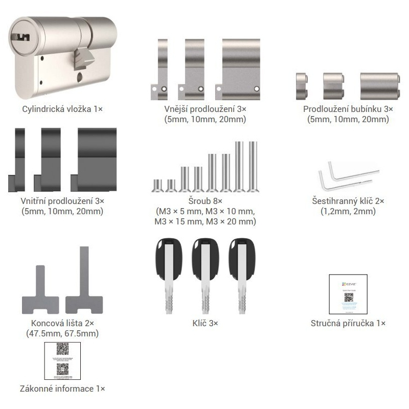 Pokud váše stará cylindrická vložka dveří nesplňuje požadavky na instalaci pro konkrétní chytré zámky EZVIZ, můžete ji nahradit touto nastavitelnou cylindrickou vložkou EZVIZ.