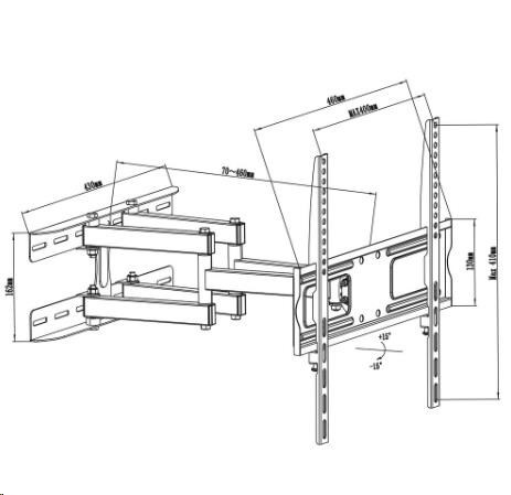 Levný ale kvalitní otočný, sklopný a délkově nastavitelný držák na televize 26-55" Držák robustní a velmi pevné konstrukce, který Vás mile překvapí svou nízkou cenou, která ale nebyla na úkor kvality. Držák má nosnost 30kg a podporuje VESA standardy 100x100 až 400x400. Je ideální pro bezpečné a spolehlivé zavěšení televizorů s úhlopříčkou 26-55" na zeď. Se zavěšenou televizí můžete otáčet na obě strany, naklápět ji nahoru nebo dole a měnit její vzdálenost od zdi - přisouvat, odsunovat, což je ideální v případě zapojování kabeláže nebo při utírání prachu. Kdykoliv máte přístup k zadní straně televize nebo k jejím bokům, což u sklopných nebo fixních držáků nelze a televizi musíte vždy sundat ze stěny. Držák má ocelovou konstrukci, která je robustní a bezpečná, barevné provedení je černé. V balení kromě samotného držáku naleznete i instalační sadu. Levný držák na televizi LCD LED plazmovou 3D nebo prohnutou, doporučená úhlopříčka 26-55 palců. Bezpečné zavěšení televize na stěnu, můžete s ní otáčet na obě strany, naklápět ji nahoru nebo dole a odsunovat nebo přisunovat ke zdi. Fiber Mounts DELTA760 / drzakyastolky.cz Technické údaje: nosnost 30kg podporuje VESA standardy 100x100 až 400x400 ideální pro zavěšení televizí a monitorů s úhlopříčkou 26-55" otáčení na obě strany +/- 75° náklon obrazovky nahoru nebo dole +/- 15° nastavení vzdálenosti od zdi 70-460mm pevná ocelová konstrukce spolehlivé a bezpečné zavěšení televizoru na zeď barva černá záruka 2 roky Držák Fiber Mounts DELTA760 podporuje VESA standardy: VESA 100x100 VESA 200x100 a 100x200 VESA 200x200 VESA 300x100 a 100x300 VESA 300x200 a 200x300 VESA 300x300 VESA 400x200 VESA 400x300 VESA 400x400 Nástěnný levný držák Fiber Mounts DELTA760 je ideální pro zavěšení všech typů a velikostí televizorů nebo monitorů, které mají hmotnost do 30kg a které podporují některý z výše uvedených VESA standardů..