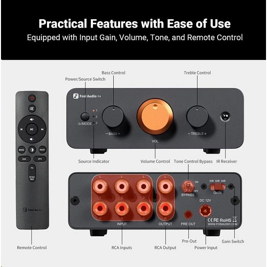 Kompaktní stereo předzesilovač v hlíkovém šasi s korekcí basů a výšek. Bypass režím, tříúrovňový zisk, motorový analogový potenciometr. SNR ?110 dB, dynamický rozsah ?110 dB, THD+N ?0,003 %, frekvenční odezva 20 Hz–20 kHz (±0,1 dB). Vstupy: 3x RCA. Výstupy: 1x RCA, 1x Pre-Out. Napájení 12 V / 1,5 A. Součást balení: D.O, napájecí adaptér 12 V, manuál..