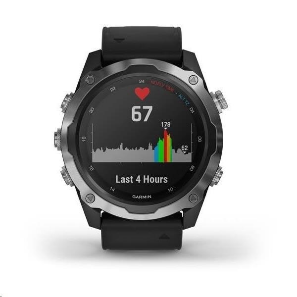 Potápěčský počítač s funkcemi chytrých a sportovně všestranných GPS hodinek, s mapami, MP3 hudbou a bezkontaktními platbami Garmin Pay. Safírové sklo, ocelová luneta, silikonový řemínek.