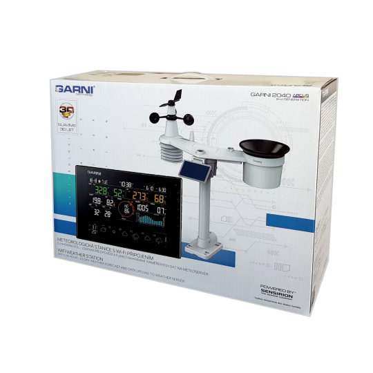 Integrované bezdrátové čidlo 7-v-1 GARNI 1NG měří vnější teplotu a relativní vlhkost, rychlost a směr větru, dešťové srážky, UV index a sluneční záření, a data jsou odesílána do hlavní jednotky až do vzdálenosti 150 m (v otevřeném prostoru). Napájení zajišťuje zajišťuje vestavěný kapacitor, který je nabíjen pomocí vestavěného solárního panelu. Baterie slouží jako záložní zdroj. Čidla jsou kompletně smontovaná a kalibrovaná tak, aby pro vás byla instalace co nejjednodušší. Hlavní jednotka je osazena snadno čitelným displejem VA displejem s ultračerným pozadím s možností automatické regulace jasu, který kromě dat ze všech připojených čidel (např. čidla pro měření teploty a relativní vlhkosti, bazénové čidlo, čidlo vlhkosti a teploty půdy, čidlo detekce blesků, čidlo kvality vzduchu) zobrazuje předpověď počasí, barometrický tlak, indexy počasí spolu s pokročilými funkcemi a informacemi, jako je výstražný alarm pro vysoké/nízké naměřené hodnoty a ztrátu spojení s čidly prostřednictvím notifikací v mobilní aplikaci a další. Vysokorychlostní procesor hlavní jednotky analyzuje naměřené hodnoty meteorologických veličin, vestavěná paměť uchovává maximální / minimální naměřené hodnoty za daný den nebo od počátku měření, a automaticky seřizuje čas a datum z internetu. Díky jednoduchému ovládání, snadné údržbě, možnosti kalibrace, zobrazení času východu a západu Slunce a Měsíce, zobrazení fází Měsíce, automatické regulaci jasu displeje, množství měřených veličin a dlouhodobé předpovědi se jedná o výjimečnou profesionální meteorologickou stanici pro váš domov.