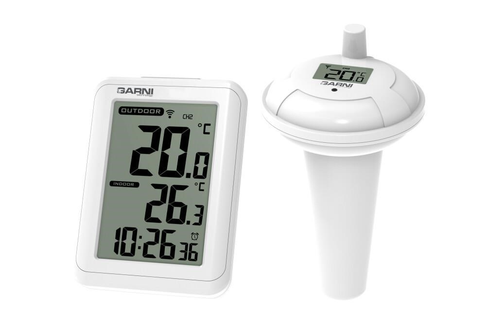 Digitální teploměr s bazénovým čidlem GARNI 245P pro měření teploty vody zobrazuje také teplotu na místě hlavní jednotky a čas. Bezdrátové bazénové čidlo GARNI 065P je kompatibilní s meteorologickými stanicemi GARNI 612 Precise, GARNI 615W Precise, GARNI 615B Precise, GARNI 618W Precise a GARNI 618B Precise.