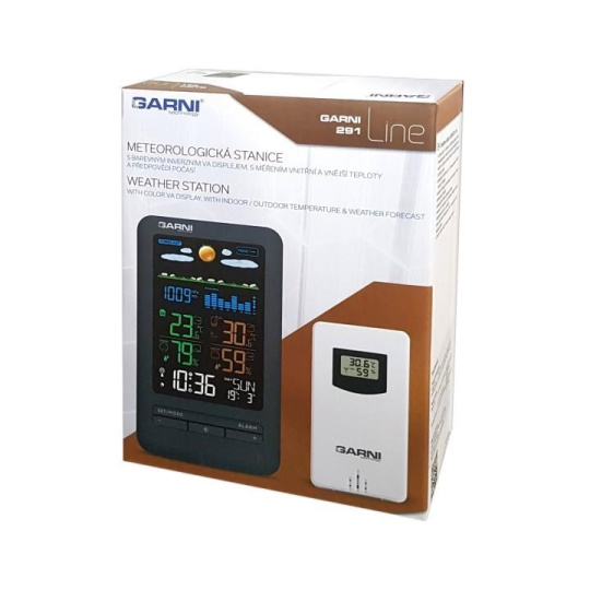 Meteorologická stanice se špičkovým inverzním barevným VA displejem s časem řízeným rádiovým signálem DCF-77, budíkem, měřením vnitřní teploty, relativní vlhkosti a absolutního barometrického tlaku a bezdrátovým čidlem pro měření vnější teploty a relativní vlhkosti inverzní barevný VA displej o rozměrech 64 x 94 mm s možností stálého osvětlení při napájení síťovým adaptérem, nebo krátkodobým osvětlením na 15 s při napájení bateriemi 4 stupně jasu osvětlení displeje, možnost vypnutí osvětlení displeje s možností krátkodobého osvětlení na 15 s (při napájení síťovým adaptérem) funkce automatického ztlumení osvětlení displeje v nastavený časový interval velikost číslic na displeji – čas 12 mm, datum 5,5 mm, zkratka názvu dne 6 mm, barometrický tlak 8 mm, vnitřní a vnější teplota a rel. vlhkost 13 mm čas a datum řízené signálem DCF-77 s možností manuálního nastavení ikona příjmu signálu DCF-77 zkratka názvu dne v češtině, angličtině, němčině, francouzštině, italštině, španělštině, portugalštině, nizozemštině, dánštině, norštině, švédštině, polštině, finštině, maďarštině a ruštině 12ti, nebo 24 hodinový formát zobrazení času možnost nastavení časového pásma od -12 do +12 hodin 2 budíky, možnost nastavení buzení každý den, v pracovní dny, nebo pouze o víkendu funkce opakovaného buzení (Snooze) po 5 minutách budící signál - 10 sekund 1 pípnutí za sekundu, 10 sekund 2 pípnutí za sekundu, 10 sekund 3 pípnutí za sekundu a poté stálé 4 pípnutí za sekundu 5 ikon předpovědi počasí (slunečno, polojasno, oblačno, srážky a sněžení) na základě sledování barometrického tlaku vestavěným barometrickým čidlem zobrazení hodnot vnitřní a vnější teploty a relativní vlhkosti paměť na maximální a minimální naměřené hodnoty teploty a rel. vlhkosti měření absolutního barometrického tlaku (hPa / mb nebo inHg) šipky tendence vývoje absolutního barometrického tlaku, vnitřní a vnější teploty a rel. vlhkosti sloupcový graf vývoje barometrického tlaku za uplynulých 24 hodin. 3 ikony stavu vnitřní a venkovní relativní vlhkosti možnost nastavení alarmu horní meze venkovní teploty v rozsahu od -39°C do +70°C a dolní meze venkovní teploty v rozsahu od -40°C do +69°C (akustickým signálem a ikonou na displeji) pro každý kanál zvlášť indikace námrazy ikonou na displeji, pokud bude naměřena venkovní teplota rozsahu od -1°C do +3°C některým z přihlášených bezdrátových čidel zobrazení teploty ve °C, nebo °F možnost použití až 3 bezdrátových čidel GARNI 30H (jedno čidlo GARNI 030H je součástí dodávky) funkce automatického přepínání kanálů bezdrátový přenos hodnot vnější teploty a relativní vlhkosti na frekvenci 433,92 MHz ikona příjmu signálu bezdrátového čidla ikony slabých baterií napájení síťovým adaptérem nebo bateriemi možnost postavení barva černá Bezdrátové čidlo GARNI 030H vlhkosti odolné displej o rozměrech 19 x 11 mm velikost číslic na displeji: teplota a relativní vlhkost 4 mm měření teploty a relativní vlhkosti 3 kanály maximální RF výkon 10 dBm (10 mW) možnost postavení a zavěšení barva bílá Obsah balení: 1 x hlavní jednotka GARNI 291 Line 1 x bezdrátové čidlo GARNI 030H 1 x síťový adaptér český, slovenský, německý, anglický, nizozemský, polský a maďarský návod.