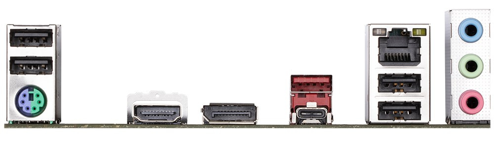 1 x PS/2 keyboard/mouse port 1 x USB Type-C® port, with USB 3.2 Gen 2x2 support 1 x USB 3.2 Gen 2 Type-A port (red) 4 x USB 2.0/1.1 ports 1 x HDMI port 1 x DisplayPort 1 x RJ-45 port 3 x audio jacks