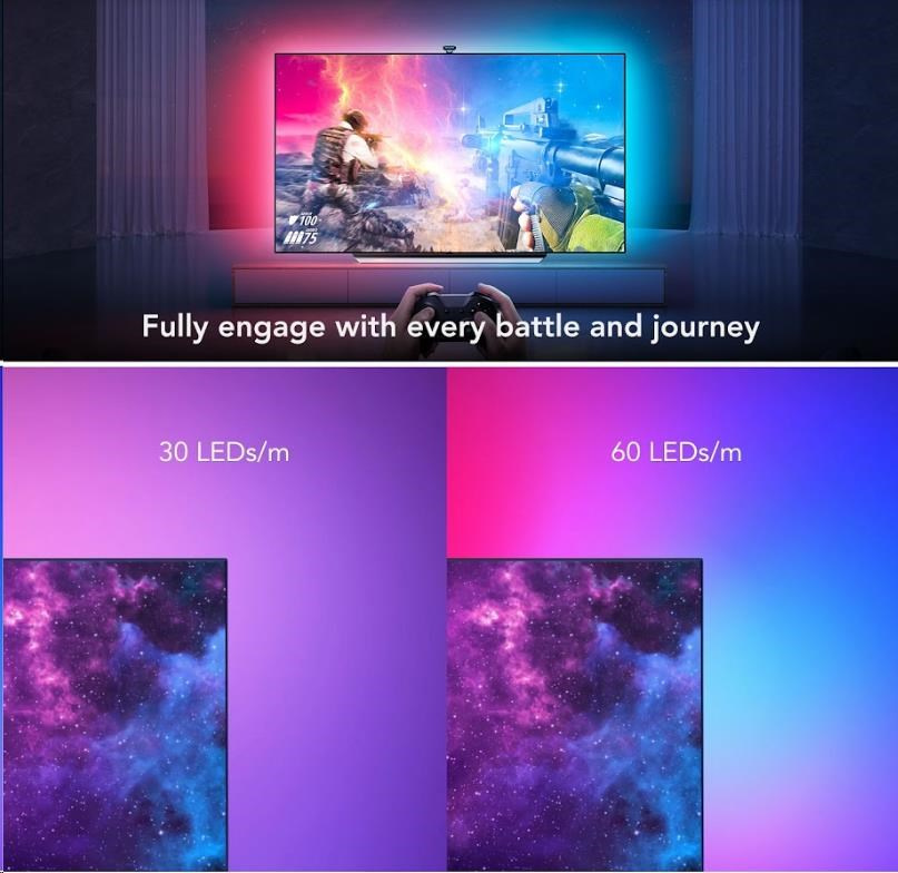 LED pásky se instalují na zadní stranu TV o velikosti 55-65 palců. Je možné je rozdělit na více barevných částí a kombinovat jejich barevné provedení. Objevte vysokou úroveň zážitku při sledování filmů nebo hraní her s dynamickými barvami vyzařujícími ze všech koutů vaší obrazovky (není optimalizováno pro zakřivené televizory). V balení se nachází 4 propojené pásky, které se instalují na zadní stranu TV nebo monitoru.