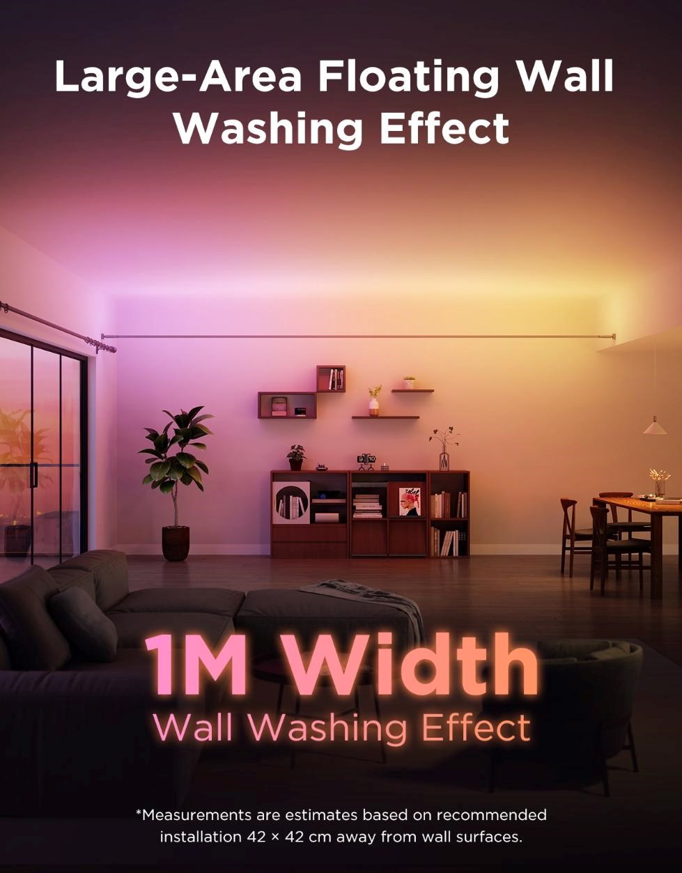 Díky zavěšené instalaci vytváří Govee Strip Light jedinečný „floating“ efekt, který rovnoměrně osvěcuje stěny záplavou barev. Pokročilá technologie LED RGBICWW společně se systémem LuminBlend™ zajišťuje plynulé přechody a ohromující vizuální zážitek. Výsledkem je velkoplošné nasvícení, které okamžitě promění každou místnost v moderní a dynamický prostor.
