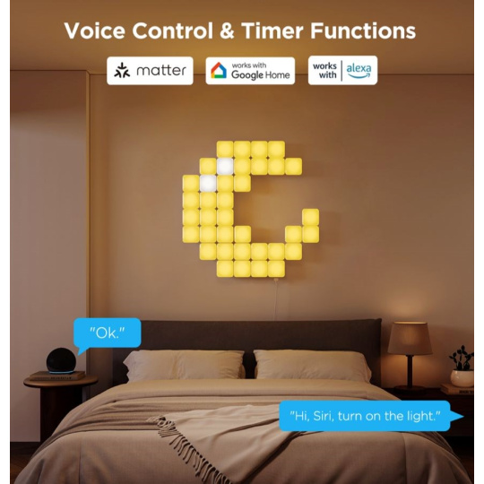 Užijte si pohodlí chytrého ovládání díky kompatibilitě s Matter, Google Home, Amazon Alexa a Siri. Stačí jediný hlasový příkaz, a vaše Govee Mini Panel Lights se přizpůsobí přesně vašim potřebám – ať už jde o zapnutí, změnu barev nebo nastavení intenzity. S funkcí časovače můžete snadno naplánovat osvětlení podle vašeho denního rytmu a vytvořit ideální atmosféru kdykoliv.