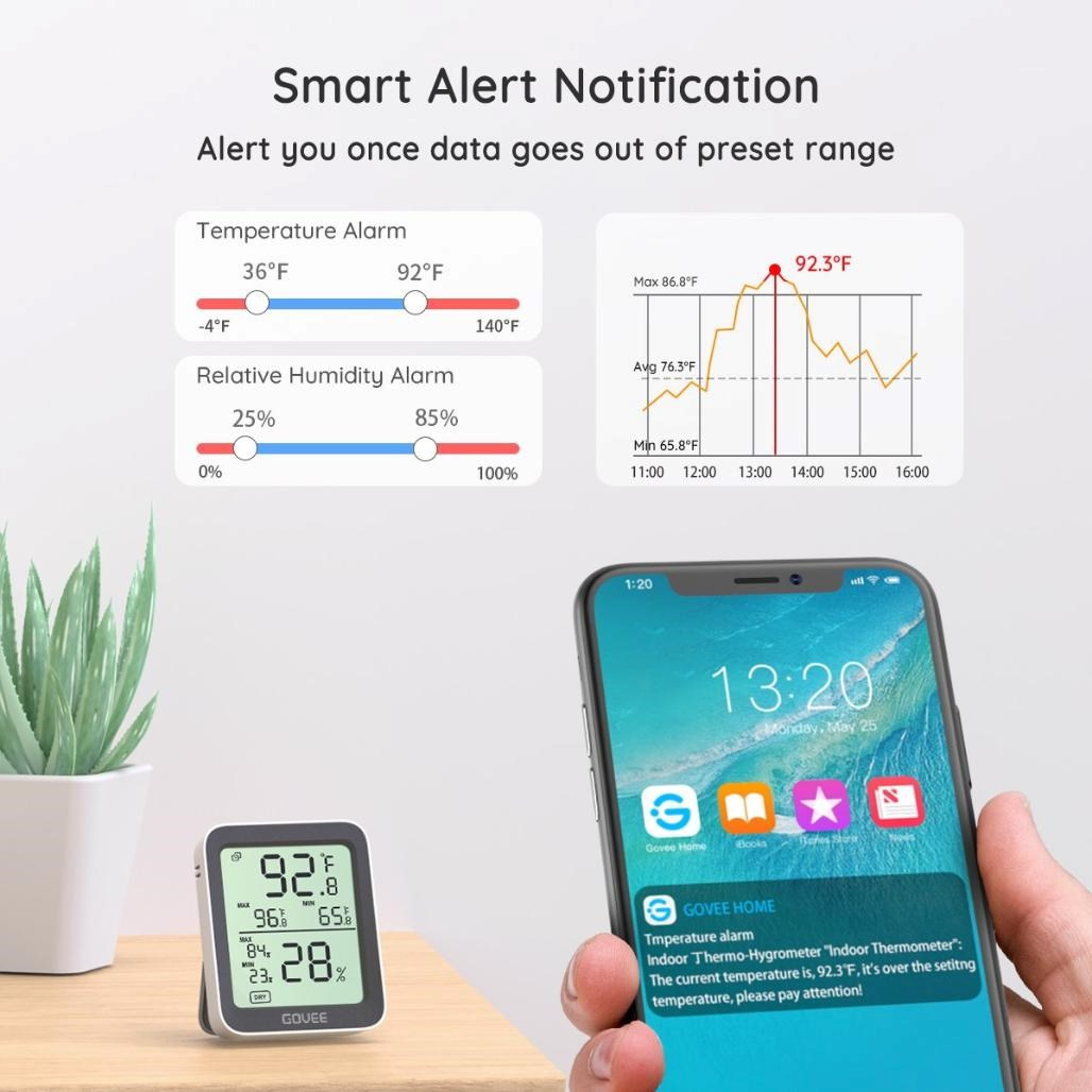 Pomocí nastavitelných upozornění v aplikaci Govee Home budete okamžitě informováni, pokud teplota nebo vlhkost překročí nastavené limity. Tato funkce pomáhá předcházet poškození rostlin, nábytku nebo citlivých předmětů. Upozornění se zobrazují přímo v telefonu, takže máte přehled i na dálku. Výsledkem je bezpečné, stabilní a kontrolované prostředí.