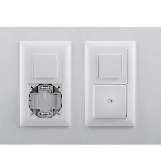 Jednoduchá integrace bateriových nástěnných dálkových ovladačů Homematic IP s rámečky o velikosti 55 mm modelové řady Ediziodue od výrobce Feller. Nevhodné pro akční členy třetích stran.