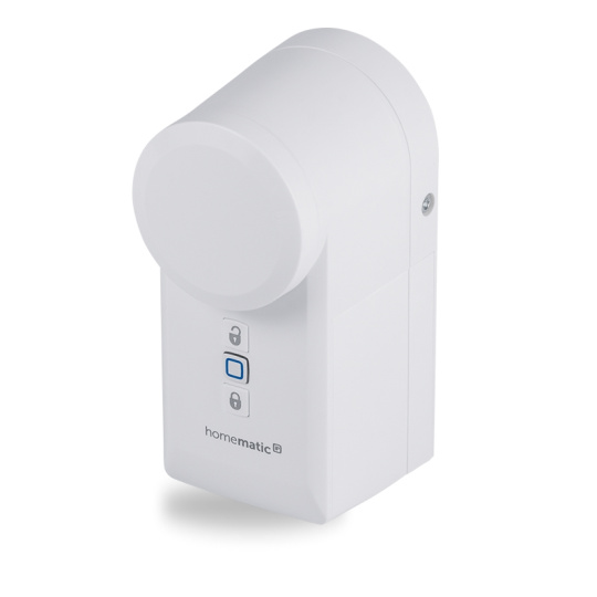 Bezdrátový inteligentní Pohon dveřního zámku (HmIP-DLD) určený k pohodlnému, motoricky poháněnému odemykání, zamykání a otevírání dveří je součástí systému chytré domácnosti Homematic IP.