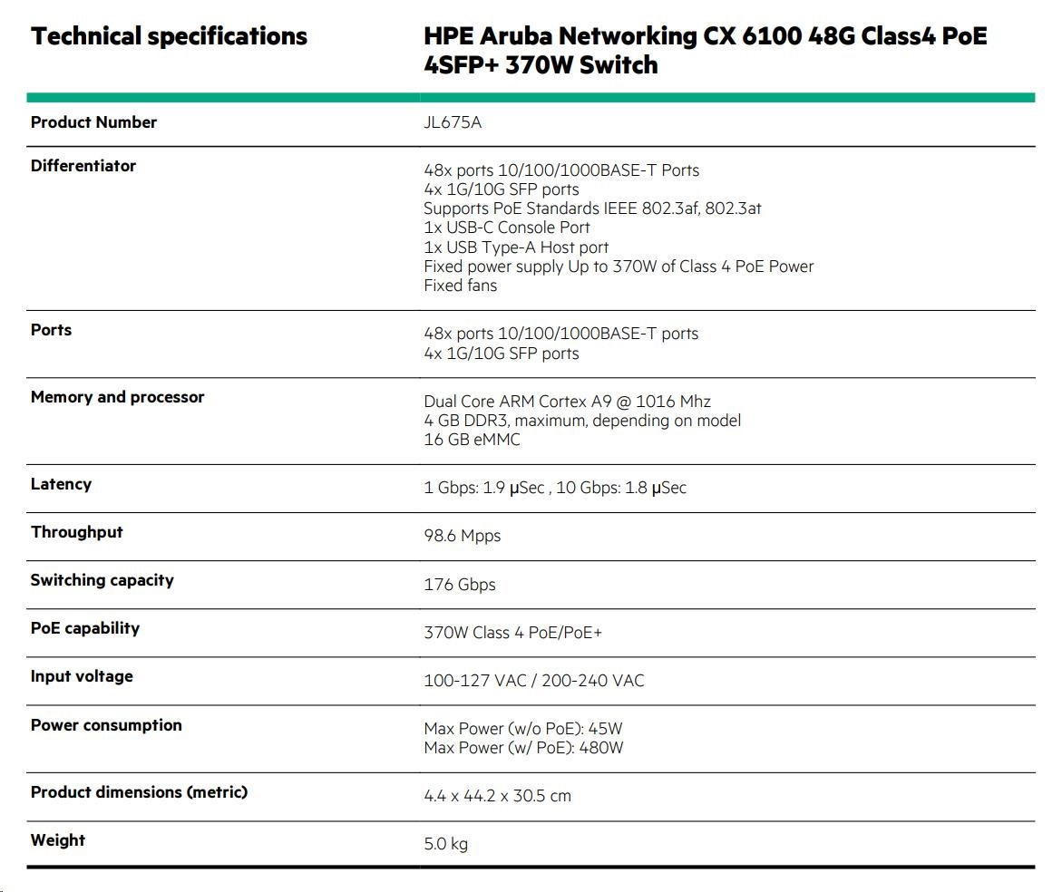 | Aruba 6100 48G Class4 PoE 4SFP+ 370W Switch (JL675A)) | |