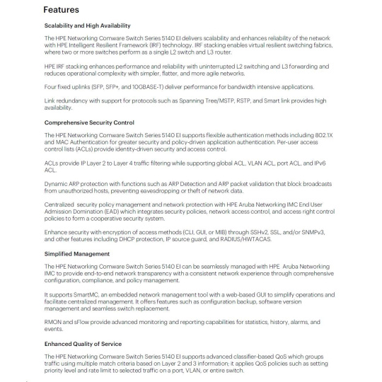 | Management | IMC - Intelligent Management Center; SmartMC; command-line interface; Web browser; SNMP Manager | |