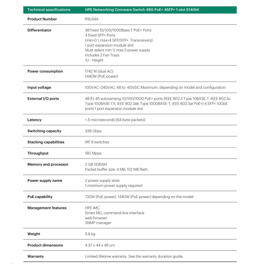 HPE FlexNetwork 5140 48G PoE+ 4SFP+ HI Switch R9L64A RENEW