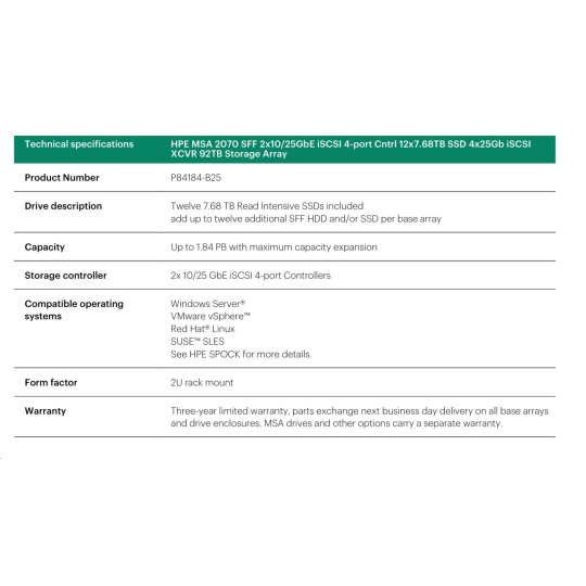 HPE MSA 2070 SFF 2x10/25GbE iSCSI 4-port Controller 12x7.68TB SSD 4x25Gb iSCSI XCVR 92TB Storage Array Smart Choice.