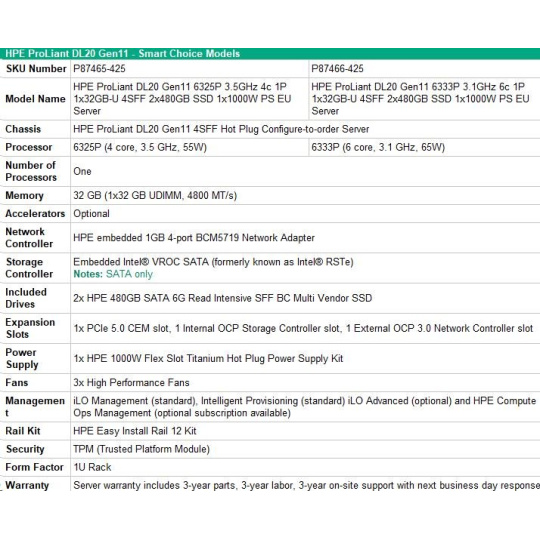 HPE PL DL20g11 6325P (3.5G/4C8T) 1x32G 2x480G SSD VROC 4SFF-HP 4p1Gb 1x1000W Smart Choice