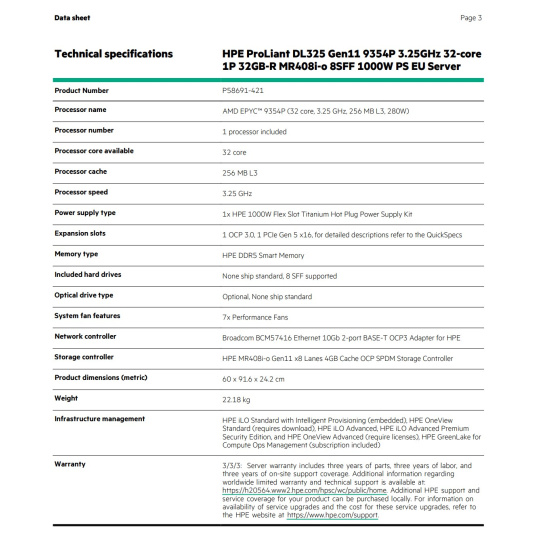 3/3/3: Server warranty includes three years of parts, three years of labor, and three years of on-site support coverage. Additional information regarding worldwide limited warranty and technical support is available at: https://h20564.www2.hpe.com/hpsc/wc/public/home. Additional HPE support and service coverage for your product can be purchased locally. For information on availability of service upgrades and the cost for these service upgrades, refer to the HPE website at https://www.hpe.com/support.