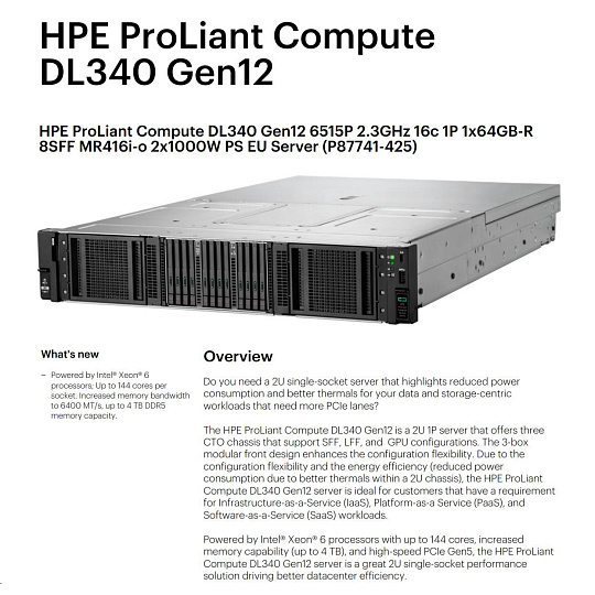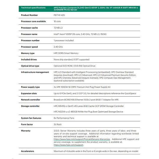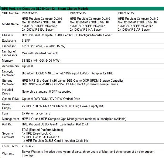 HPE PL DL340 Gen12 6515P (2.4/16C) 1x64G (P69728) NS204(2x480) MR416i-o 8SFF 2x1000W 10GbE NBD333 Smart Choice.
