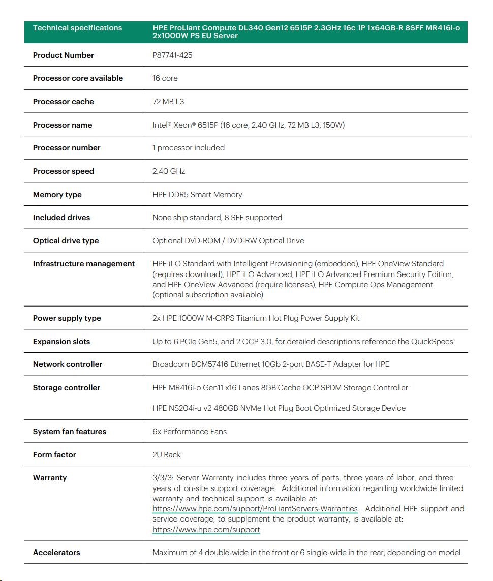 HPE PL DL340 Gen12 6515P (2.4/16C) 1x64G (P69728) NS204(2x480) MR416i-o 8SFF 2x1000W 10GbE NBD333 Smart Choice.