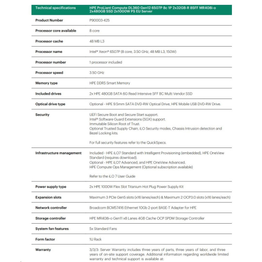 | Model Name | HPE ProLiant Compute DL360 Gen12 6507P 8c 1P 2x32GB-R 8SFF MR408i-o 2x480GB SSD 2x1000W PS EU Server |