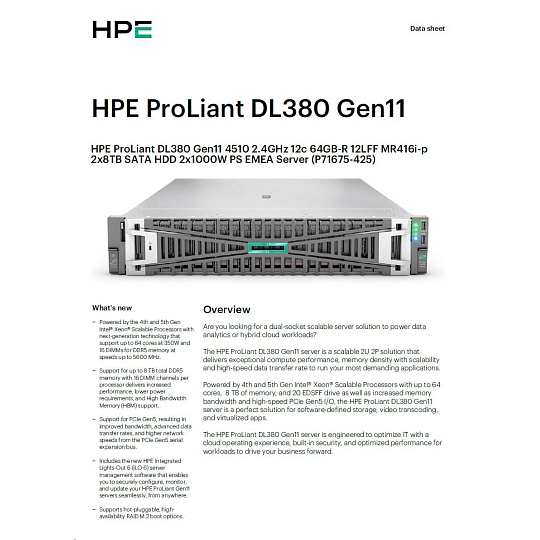 HPE PL DL380g11 4510 (2.4/12C) 2x32G 2x8TB (834028-b21) 2x1000W MR416i-p 12LFF 4x1Gb NBD333 Smart Choice