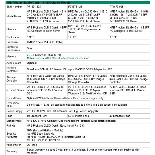 Model Name HPE PL DL380g11 4510 (2.4/12C/30M) 2x32G 2x8TB 2x1000W MR416i-p 12LFF 4x1Gb NBD333 2U