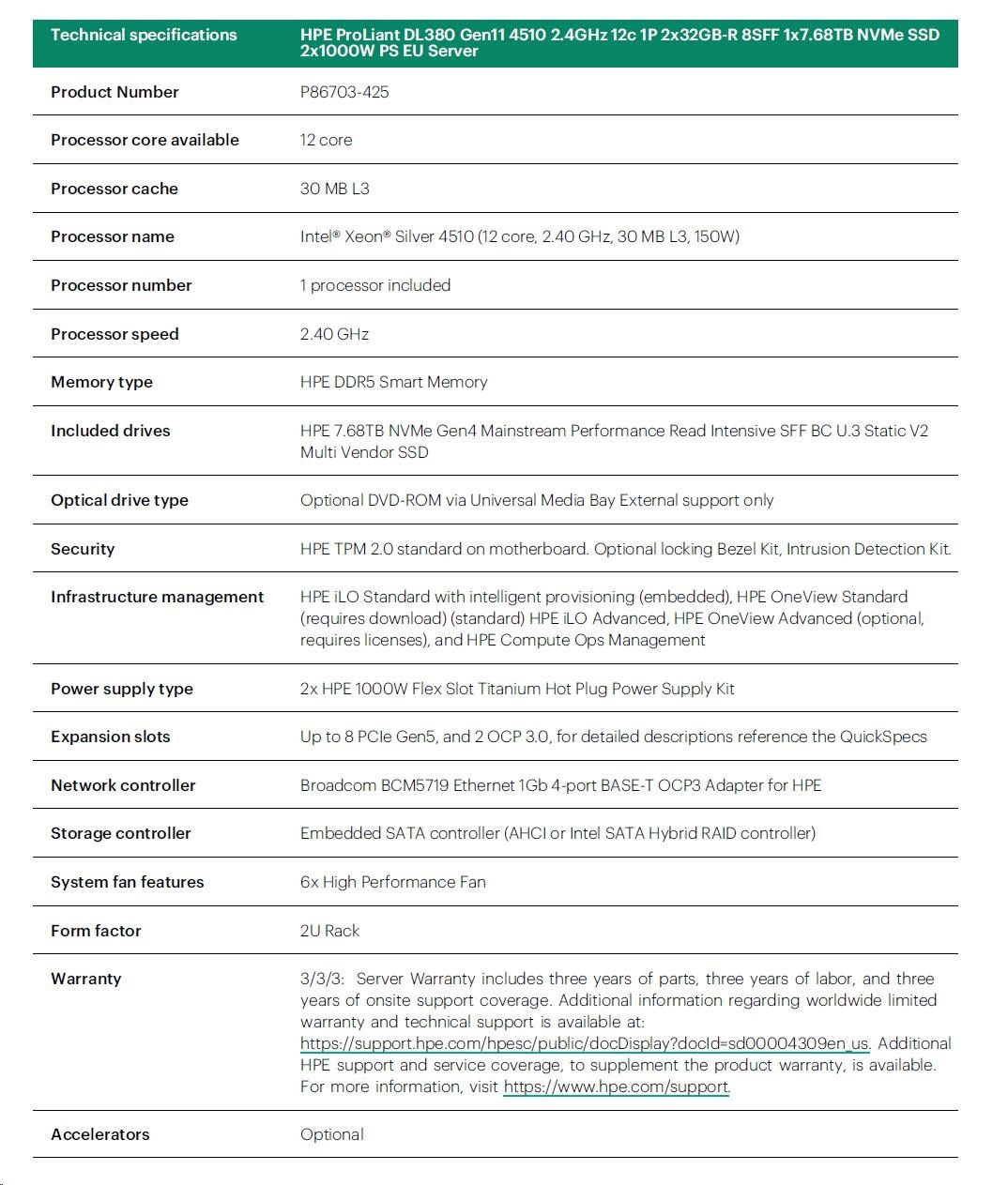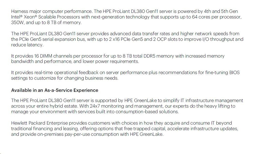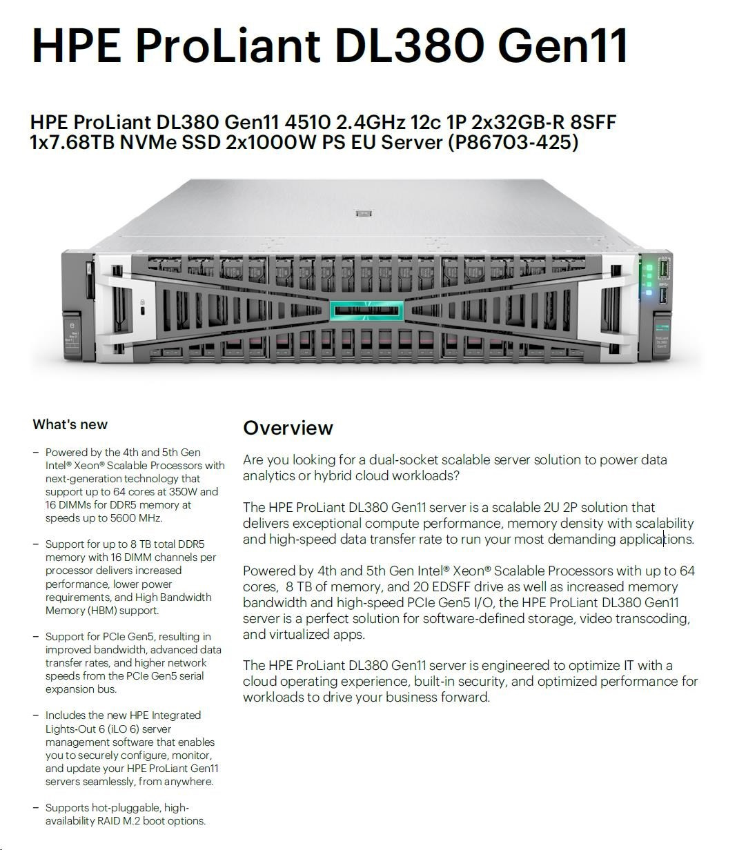 HPE PL DL380g11 4510 (2.4G/12C) 2x32G (p64706) 1x7.68TB NVMe 2x1000W 8SFF 4p1G Smart Choice.
