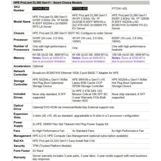 Model Name HPE PL DL380g11 6526Y (2.8G/16C) 4x32G NS204i-u(2x480g) 2x1000W 8SFF 2x10G-T Smart Choice