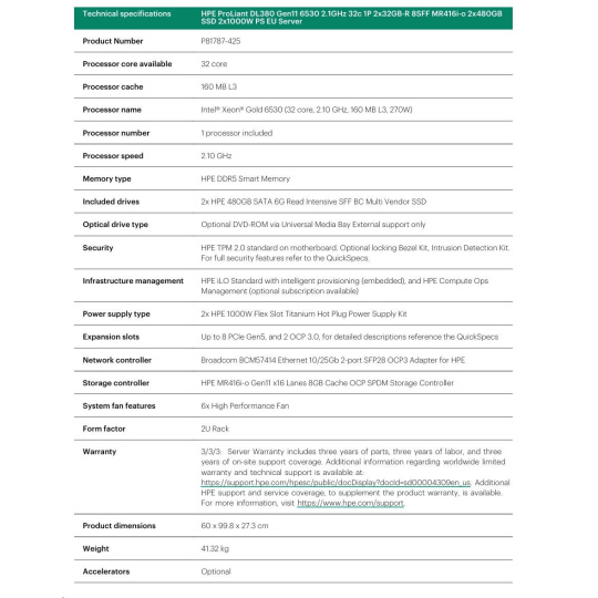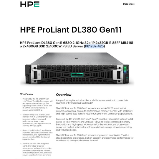 | Product Name | HPE ProLiant DL380 Gen11 6530 2.1GHz 32c 1P 2x32GB-R 8SFF MR416i-o 2x480GB SSD 2x1000W PS EU Server |