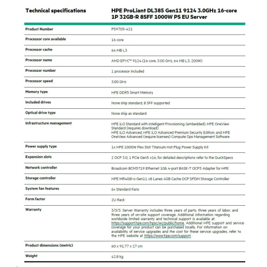 HPE PL DL385g11 AMD Epyc 9124 (3.0G/16C) 1x32G MR408i-o/4G 8-34SFF(3x8F+8M+2R) 1x1000W L9 4x1Gocp P59705-421 RENEW