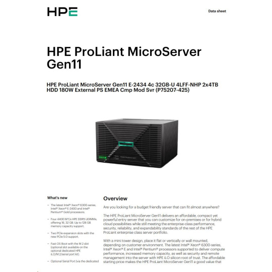 | Model Name | HPE ProLiant MicroServer Gen11 E-2434 4c 32GB-U 4LFF-NHP 2x4TB HDD 180W External PS EMEA Cmp Mod Svr |